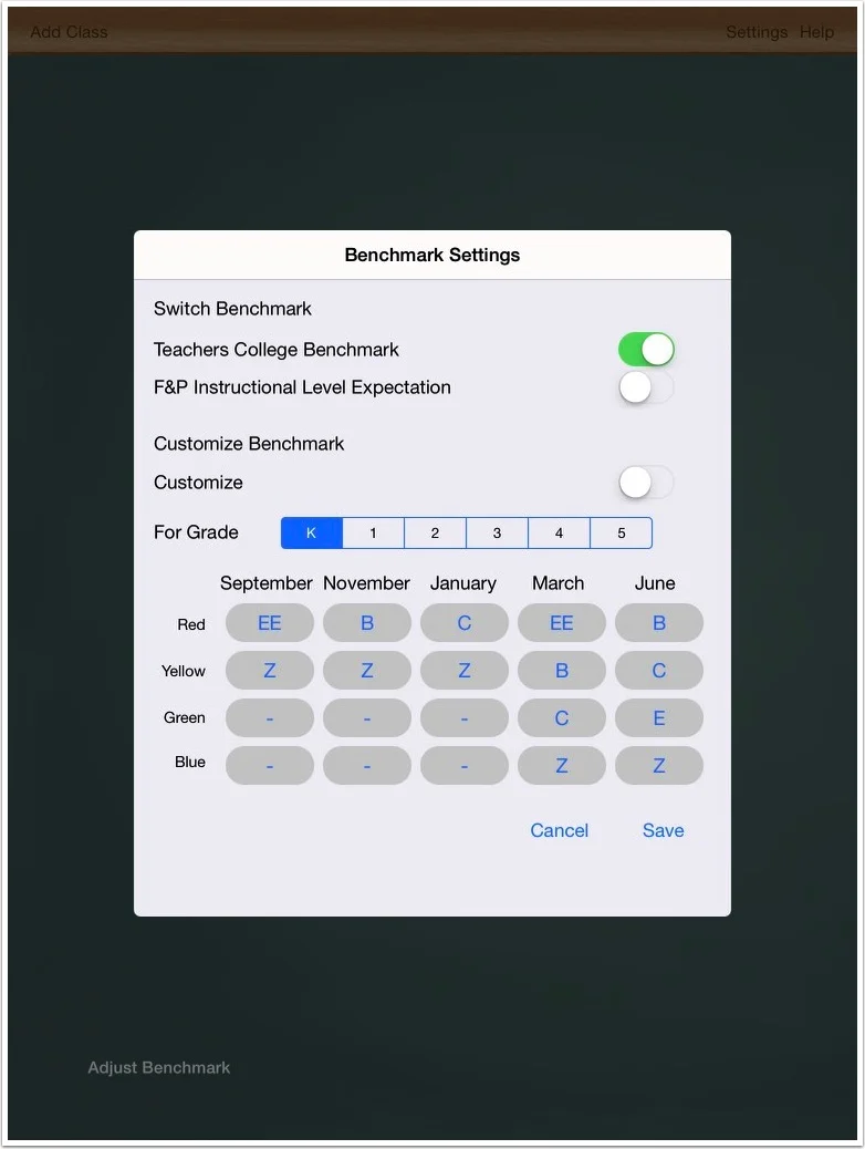 2. The default benchmark is set to Teachers College Independent Reading Levels. You can view the Teachers College benchmarks here.