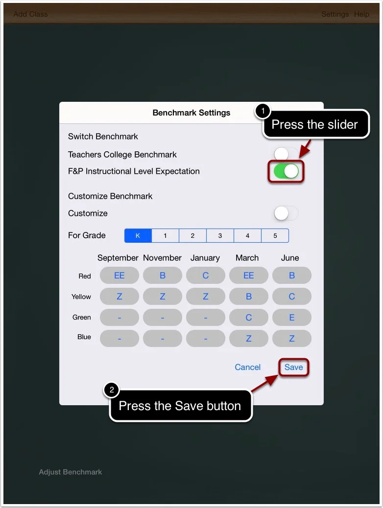 3a. To change the benchmark to Fountas & Pinnell reading levels press the F&P Instructional Level Expectation slider to the on position.