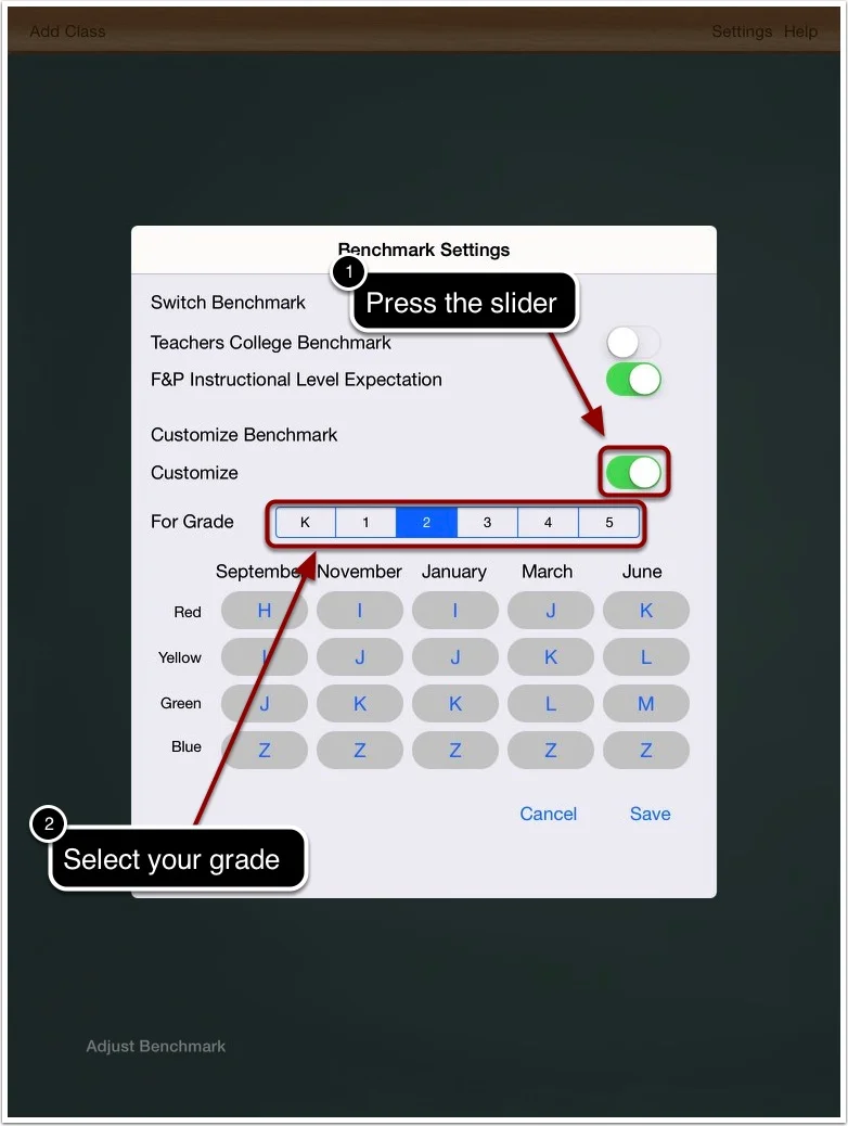 4a. To customize the reading level benchmarks completely, first press the Customize slider to the on position.